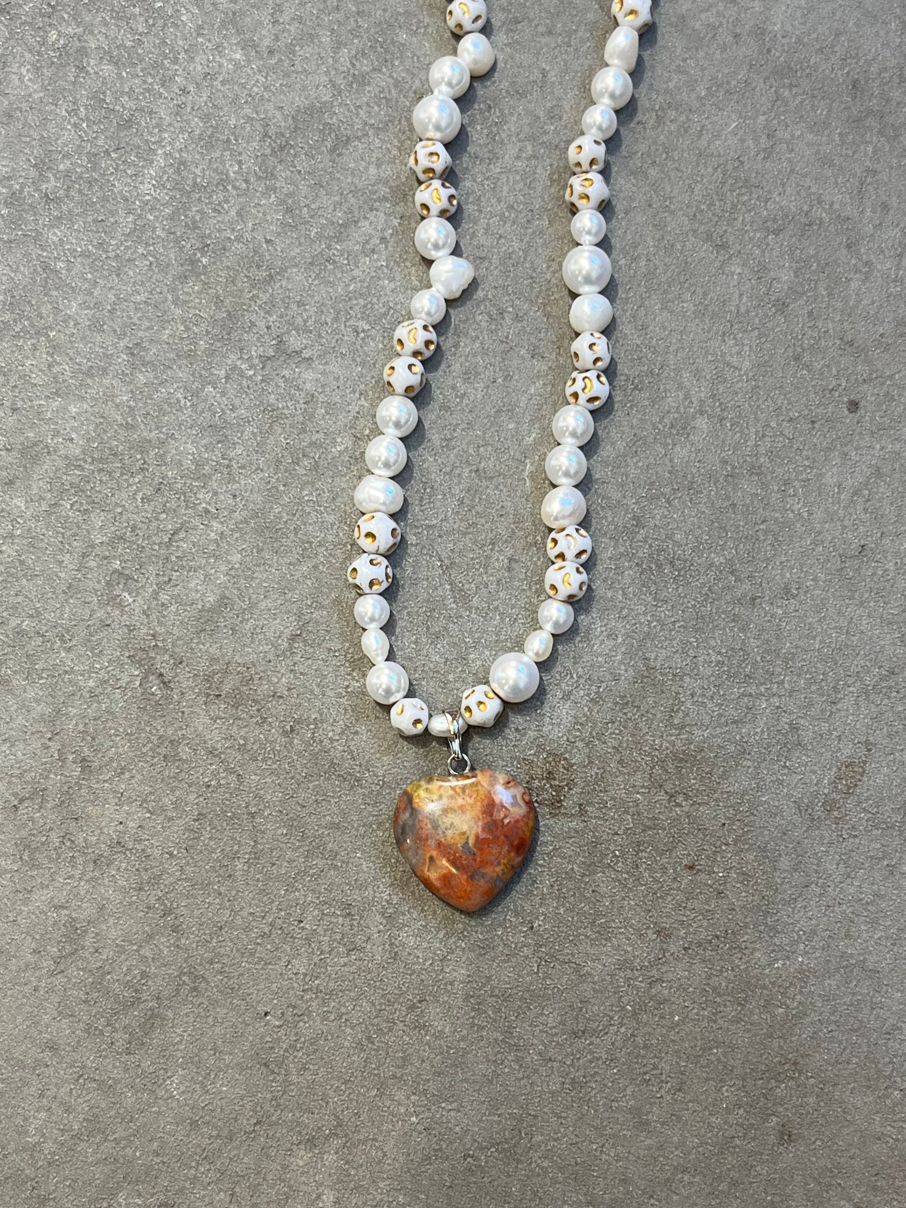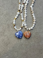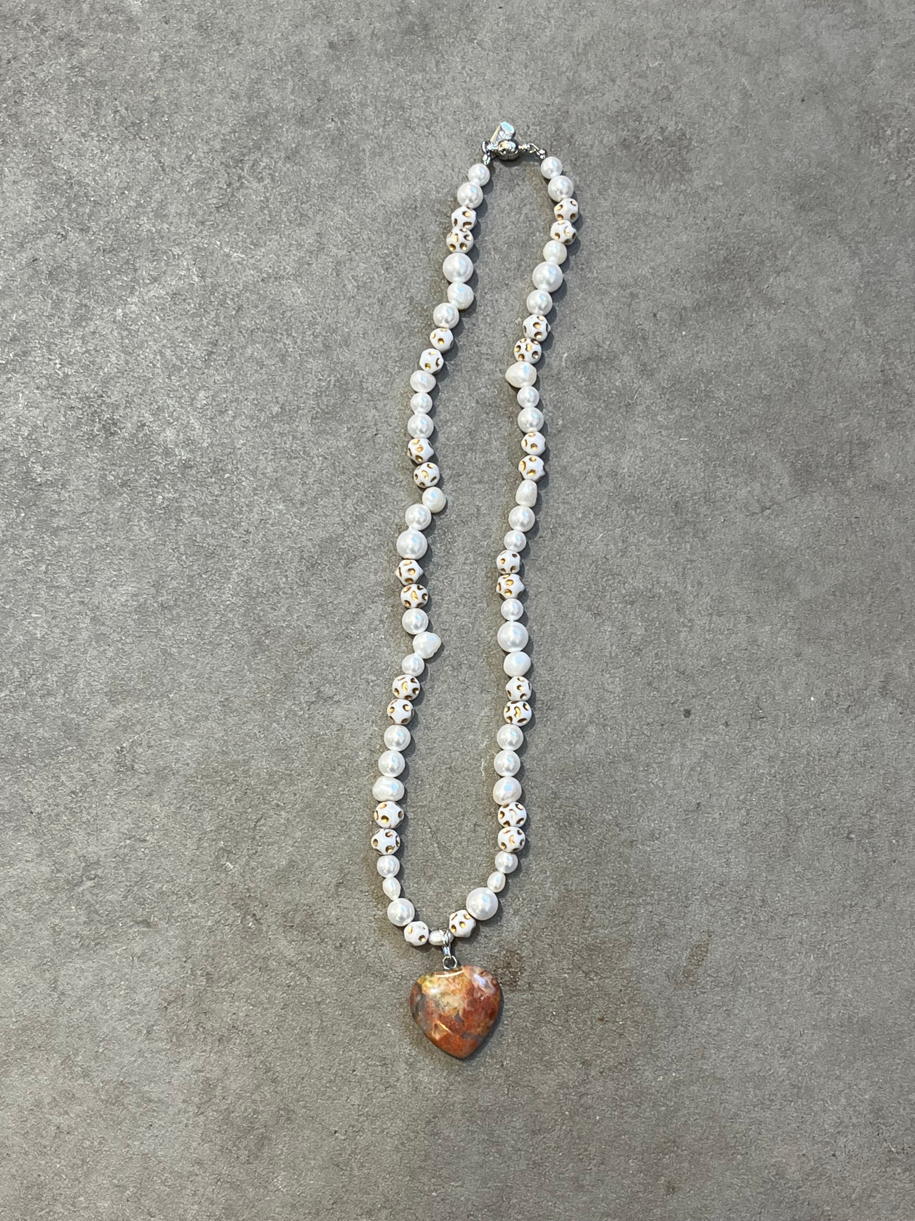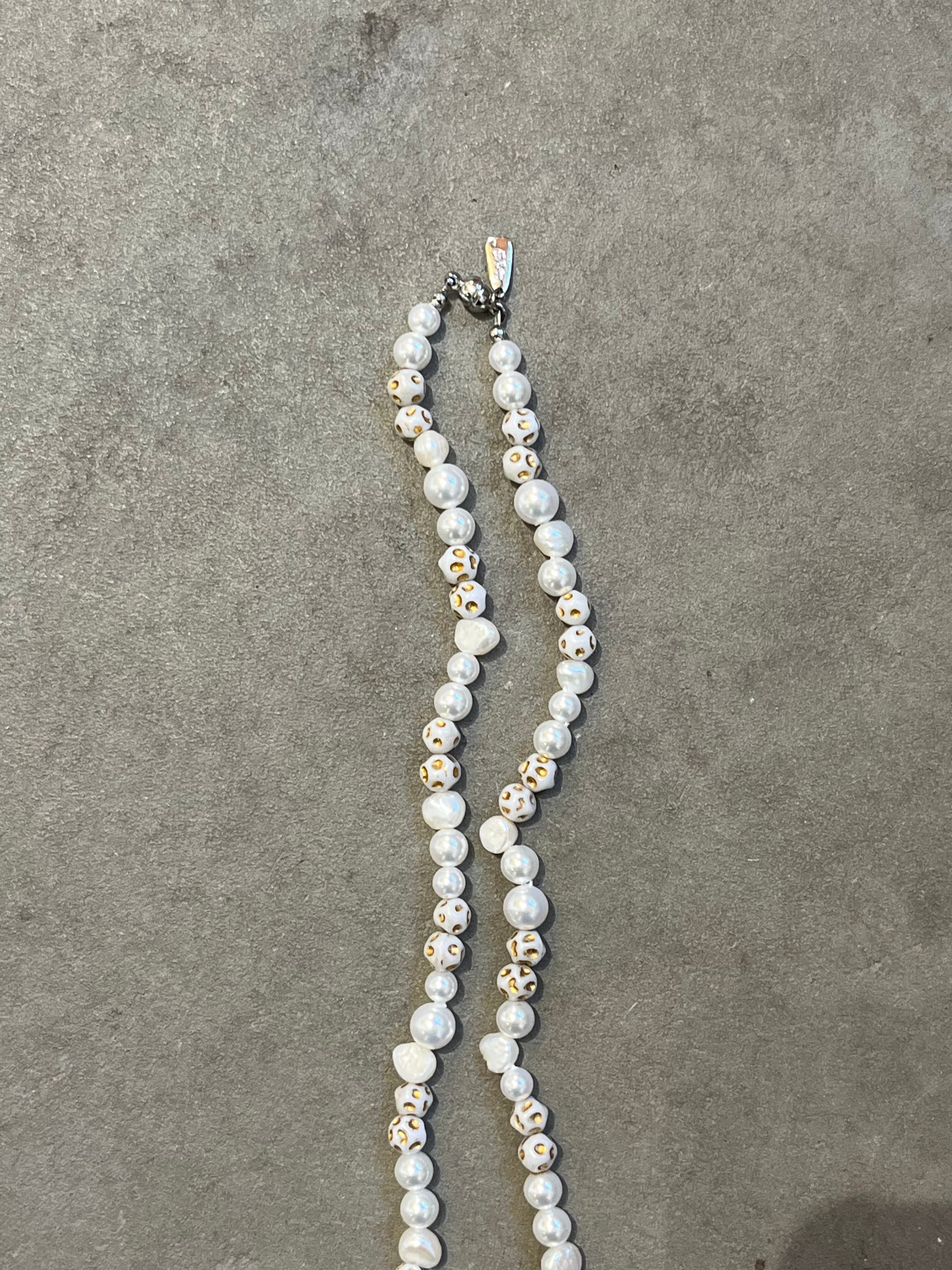 金色のドットのビーズと淡水パール、樹脂パールを使用したネックレスです。
