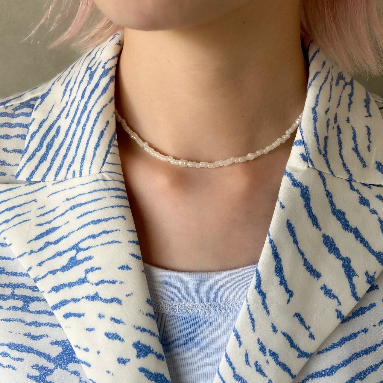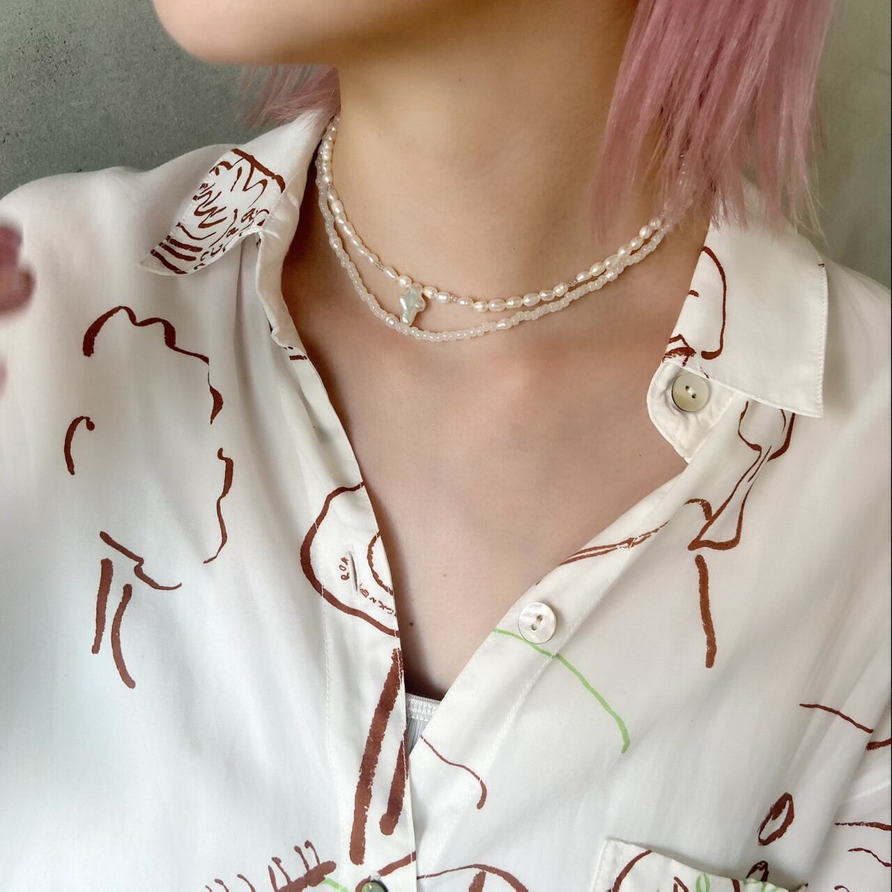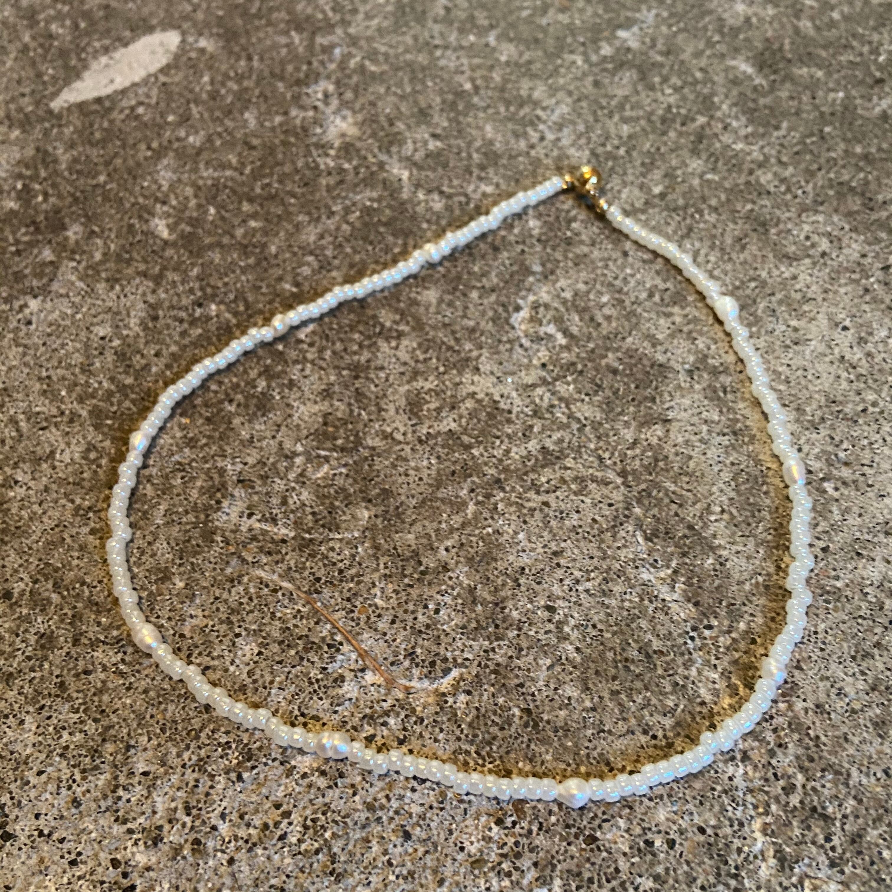 乳白色ののビーズと淡水パールを使用したネックレスです。