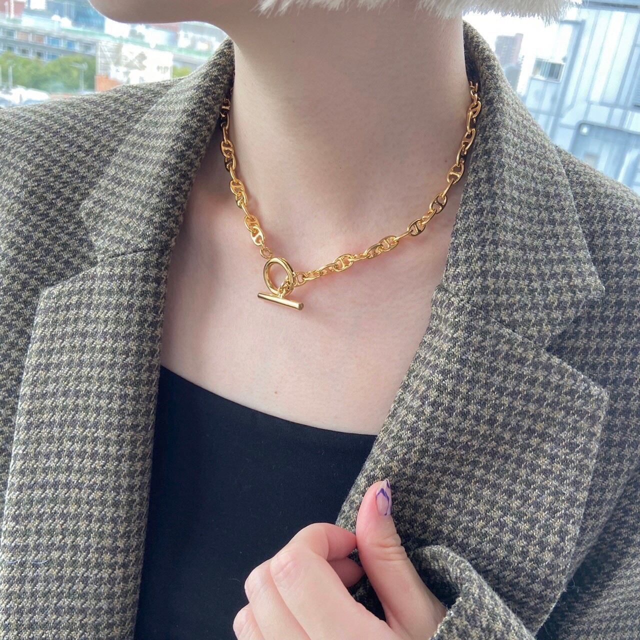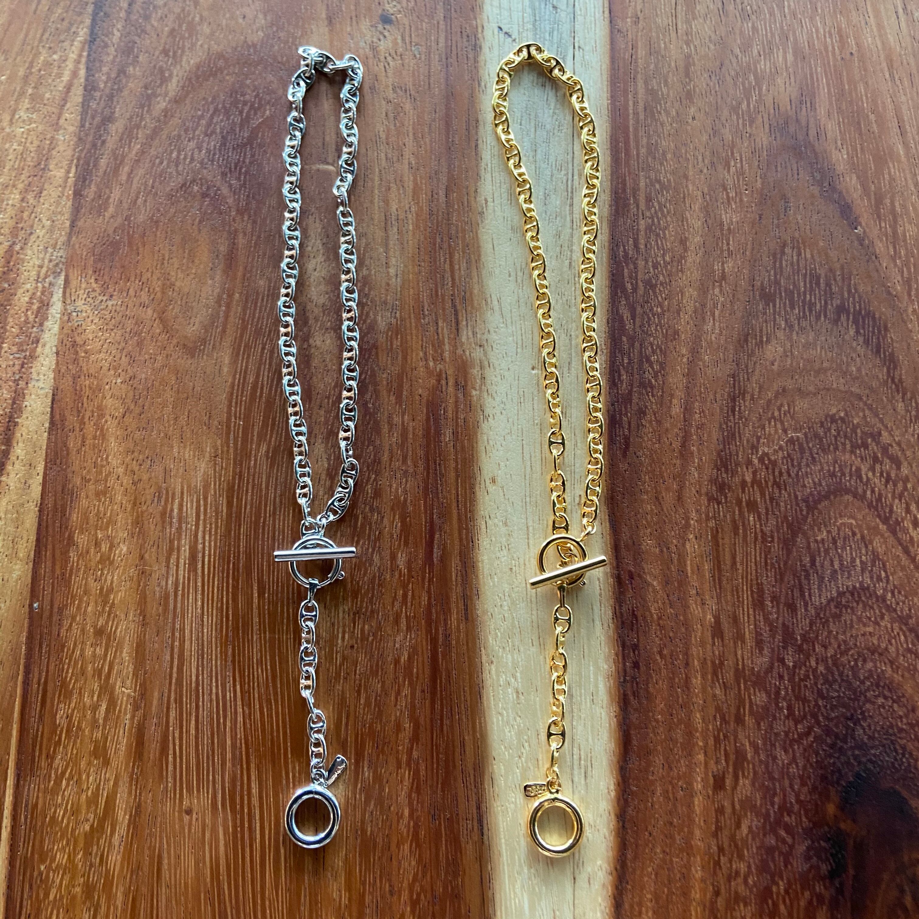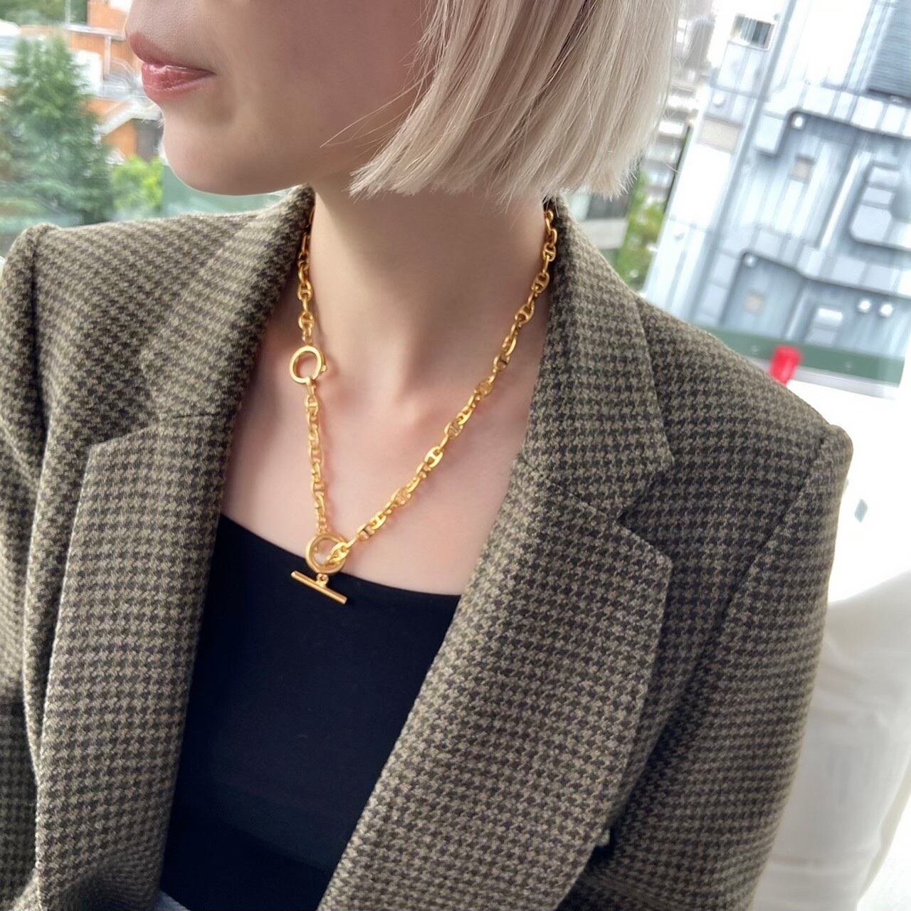 マンテルと引き輪で取り外しのできるゴールド色のマリーナチェーンネックレスです。