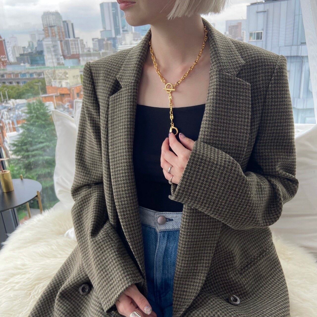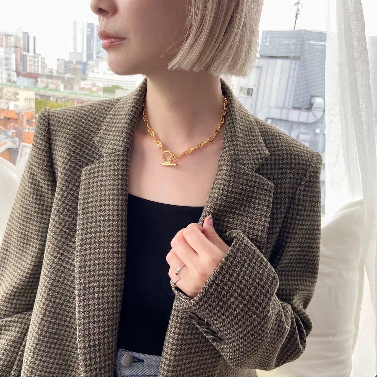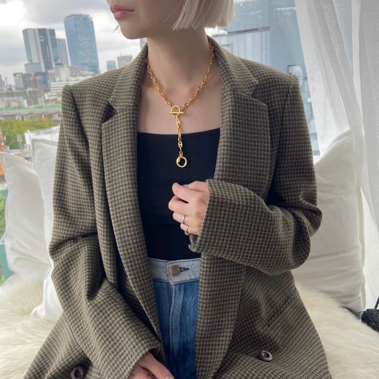 マンテルと引き輪で取り外しのできるゴールド色のマリーナチェーンネックレスです。